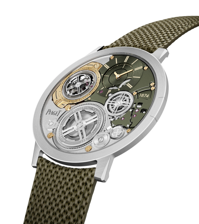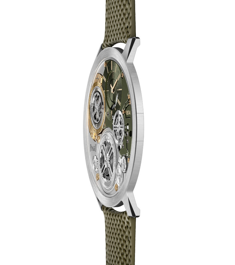 カーキグリーンのダイヤルに、カーフスキンストラップに施された新開発のポリッシュ・メッシュパターンが呼応し、エレガンスとモダンな力強さを兼ね備えた佇まいを演出。さらに、ピアジェの「インフィニトリー・パーソナル」プログラムにより、カスタマイズも可能となっている。