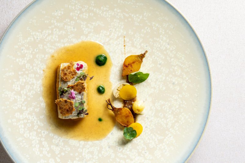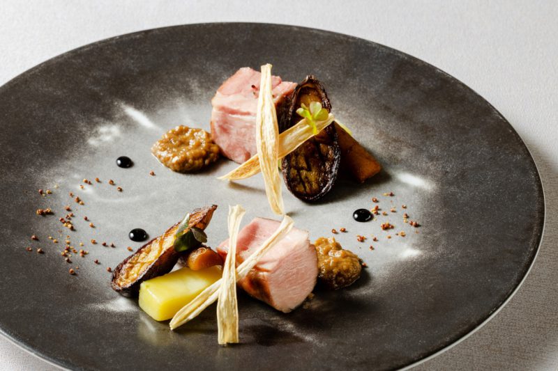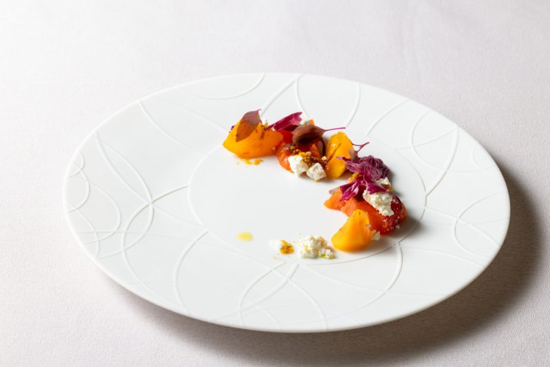 山下氏は1992年にホテルオークラ入社後、アムステルダムの「シエルブルー」や南仏の「ラ・メゾン・ジョンヌ」など海外の名店で研鑽を積み、京都・岡崎別邸の総料理長も務めた経歴を持つ。「京都の土地柄、和食文化が強いので、日本料理の技術を学び、コース内容に取り入れました。フランス料理では一般的に仔牛などを用いて出汁を取りますが、その旨味が強すぎると、かえって食材本来の味を覆い隠してしまうことがあります。そこで、例えば昆布出汁を用いることで、素材の持ち味を最大限に生かす。このようなことをメニューを組み立てる際に大切にしていきます」と抱負を語る。