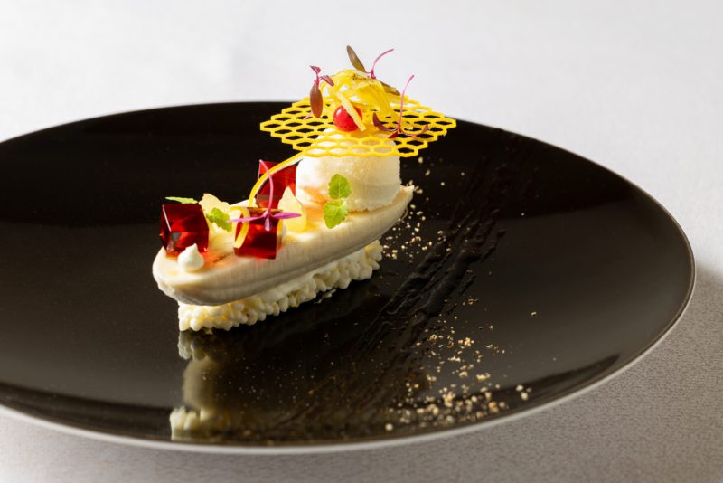 一方、荒木氏はフランス各地で修業した後、2005年よりホテルオークラ東京でパティシエとして活躍。2022年から現職を務め、「香りは記憶や感情に深く結びつく。五感に響く新しいデセールを届けたい」と意気込みを示した。和食出身という経歴も持つ荒木氏が手がけるデザートは、甘さ控えめで軽やかに食べられるものが多く、意外性に満ちている。