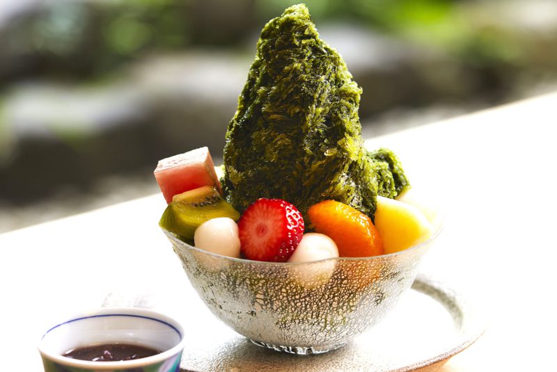 会席コースの一例「悠」では、蕪と柿を合わせた胡桃の白和えの先付に始まり、松茸だけを贅沢に使った土瓶蒸し、本鮪や紅葉鯛など旬魚の造り、鰻や絹かつぎ、焼き芋などの吹き寄せ、すっぽんを使った煮物、そしてこれまた松茸だけの釜炊き御飯まで、ひと皿ごとに深まる季節の香りが広がる。締めくくりの水菓子には、隠れた名物の「雲海」特製かき氷が用意されている。柿やらふらんすのソースといった季節の果物を使ったものから、練乳をメインに使ったしろくま風まで、自然な甘味がやさしい絶品かき氷が揃う。