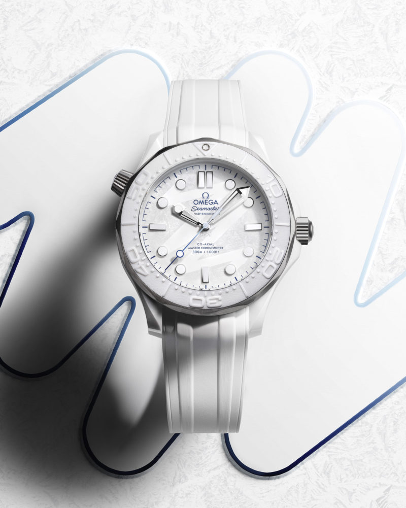 43.5mmのケースには、ホワイトセラミックとグレード5チタンという異素材を組み合わせ、冬の静寂と力強さを表現。ベゼルにはレーザー加工によるポジティブレリーフのダイビングスケールが施され、氷の質感を思わせる。ホワイトセラミックのダイヤルには、大会エンブレムに着想を得た「26」の軌跡が繊細に浮かび上がり、秒針にはブルーのグラデーションが差し込まれるなど、冬の空気を映すようなディテールが随所に息づく。