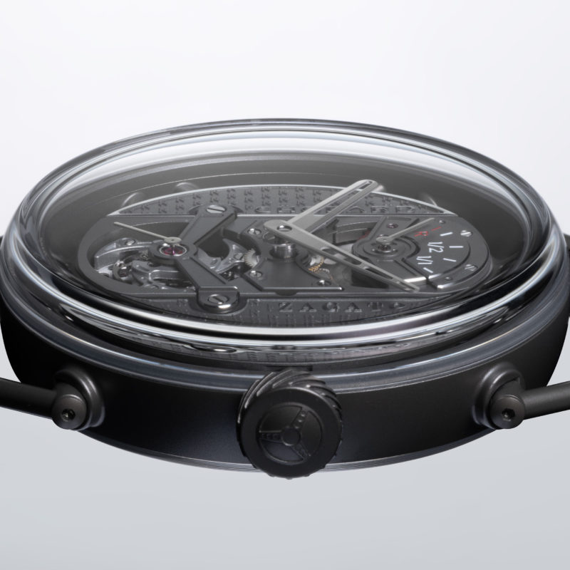ケースとムーブメントには、航空宇宙産業でも用いられるセラマイズドチタンを採用。高い耐久性と独特のアンスラサイトグレーの質感が、機能性と美を同時に表現する。チューブラー構造のケースデザインは、コンセプトカーに見られるシャシー設計を時計に転用したもので、軽量化と剛性を両立。自動車のステアリングホイールをモチーフにしたリュウズや、フューエルゲージを模したパワーリザーブ表示など、随所にレーシングスピリットが息づく。