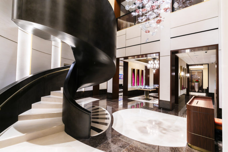 特筆すべきは、ブランドのフィロソフィーを体現した重厚な空間設計だ。ファサードには、カラトラバ十字と日本の伝統技法を融合させた「KIRIGAMI」モチーフを採用。1階にはウォッチギャラリーやマニュファクチュールの歩みを辿るエキスポエリアが設けられ、2階にはフランス人職人の手によるシャンデリアが配されたバーラウンジを完備している。