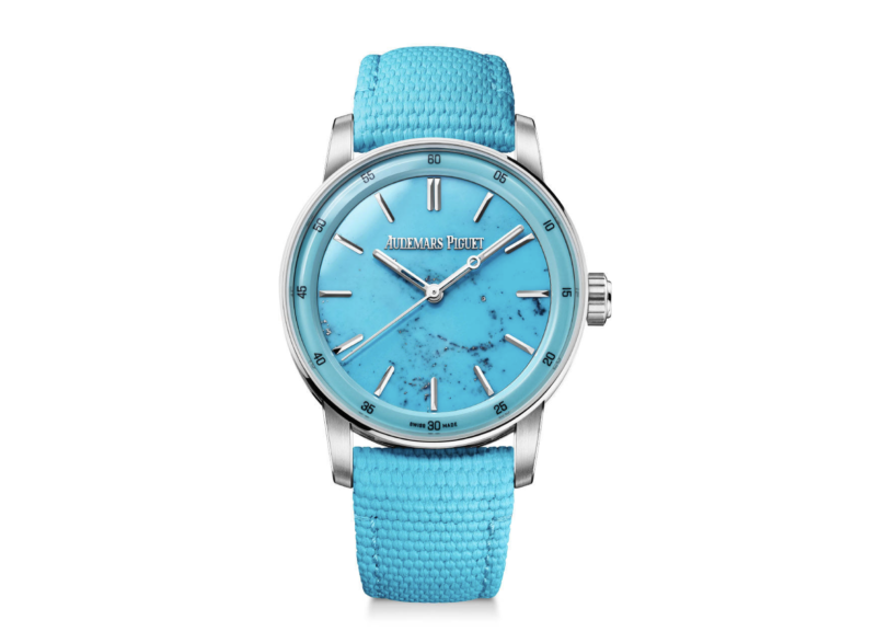 38mm径の日本先行発売モデルは、鮮烈なターコイズブルーのダイヤル。幸運の象徴ともされるターコイズ特有のマトリックス模様が、サテンとポリッシュが施されたホワイトゴールドケースと響き合い、唯一無二の個性を放つ。