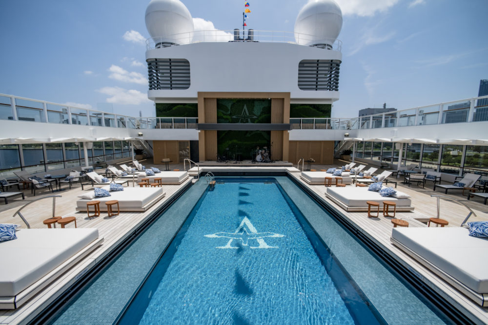 船内は13層構造となっており、6つのレストランをはじめ、ラウンジ、バー、シアター、グランドスパ(露天風呂を含む)、プール、そしてバスケットボールなどを楽しめるスポーツコートまで設えられている。