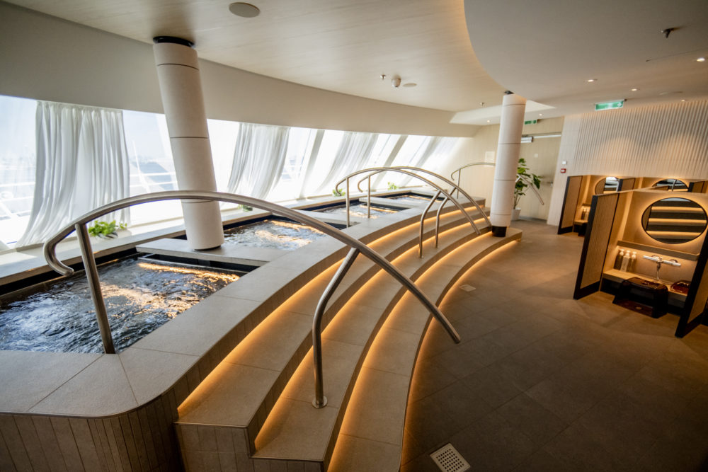 だが、この判断は大正解であった。スパは船首方向の大きな窓に面し、まるで、大海原の上に大浴場が浮かんでいるような開放感がある。外気を感じられる露天風呂も備え、流れ行く海と空を眺めながら、生まれたままの姿で、湯船のなかで手足を伸ばすひとときは、まさに至福だ。