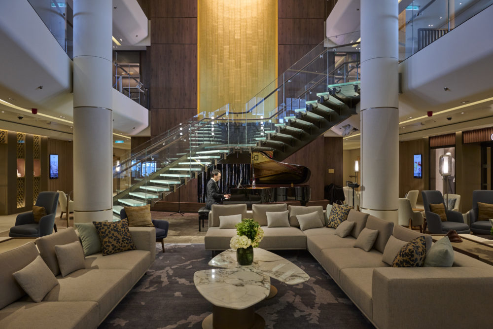 館内には至るところにアートが配され、まるで美術館に足を踏み入れたかのようだ。なかでも圧巻なのは、メインロビーの階段背面に掲げられた、高さ8.8メートルに及ぶ室瀬和美氏(蒔絵の重要無形文化財保持者・人間国宝)による漆芸作品である。その存在感と気品には、思わず息をのむ。