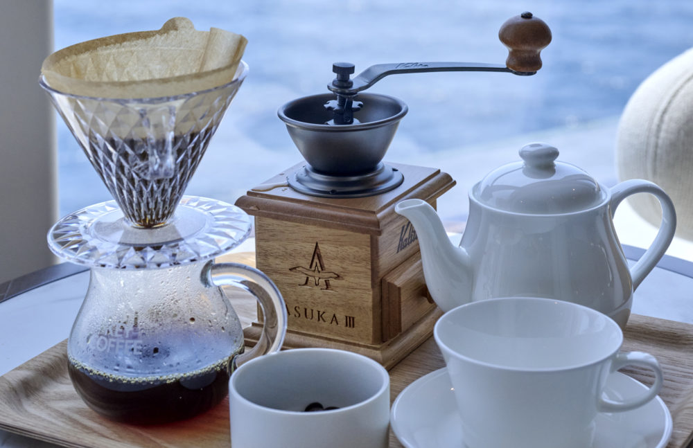「ビスタラウンジ」では、手挽きのコーヒーが楽しめる。オリジナルブレンドの豆をコーヒーミルに入れ、自らハンドルを回すのだ。洋上で味わう香り高い一杯は、また格別なものである。