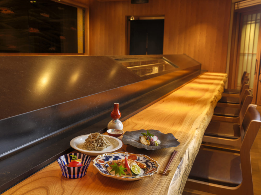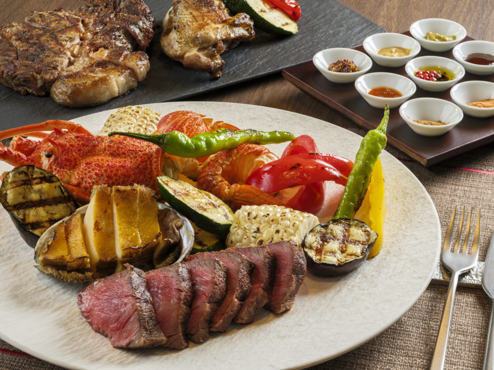 伊勢海老、アワビ、ホタテ、カニなどのシーフードや、最上級和牛などが厨房で焼き上げられ、そのまま香りごとテーブルへ届けられる。これをグリーンペッパーコーンマスタードや梅山椒など、9種類の薬味とともに楽しむのだ。海の男になったつもりで、豪快にかぶりつきたい。