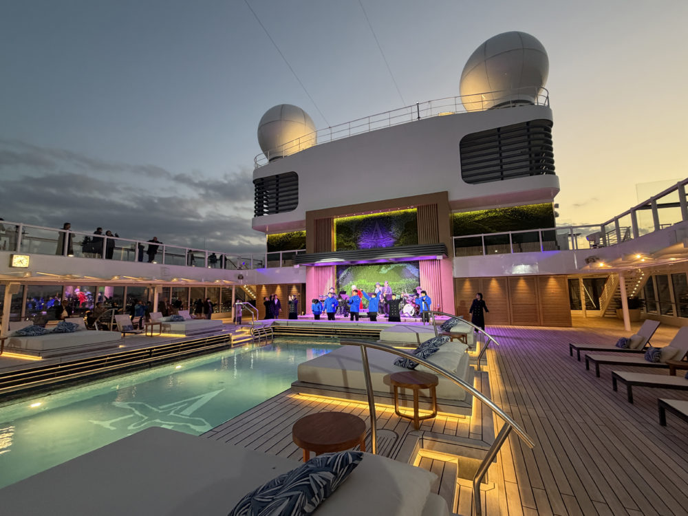 乗船してほどなく、プールデッキでは出港パーティ始まった。生演奏されたのは『セレブレーション』と『君の瞳に恋してる』。いずれも1980年代前半を代表する名曲だ。客層は九割以上が日本人で、年配の方も多いのだが、皆さん実にお元気で、ディスコミュージックが流れ始めると自然と身体が揺れ、ステップを踏む女性の姿もちらほらと見受けられた。