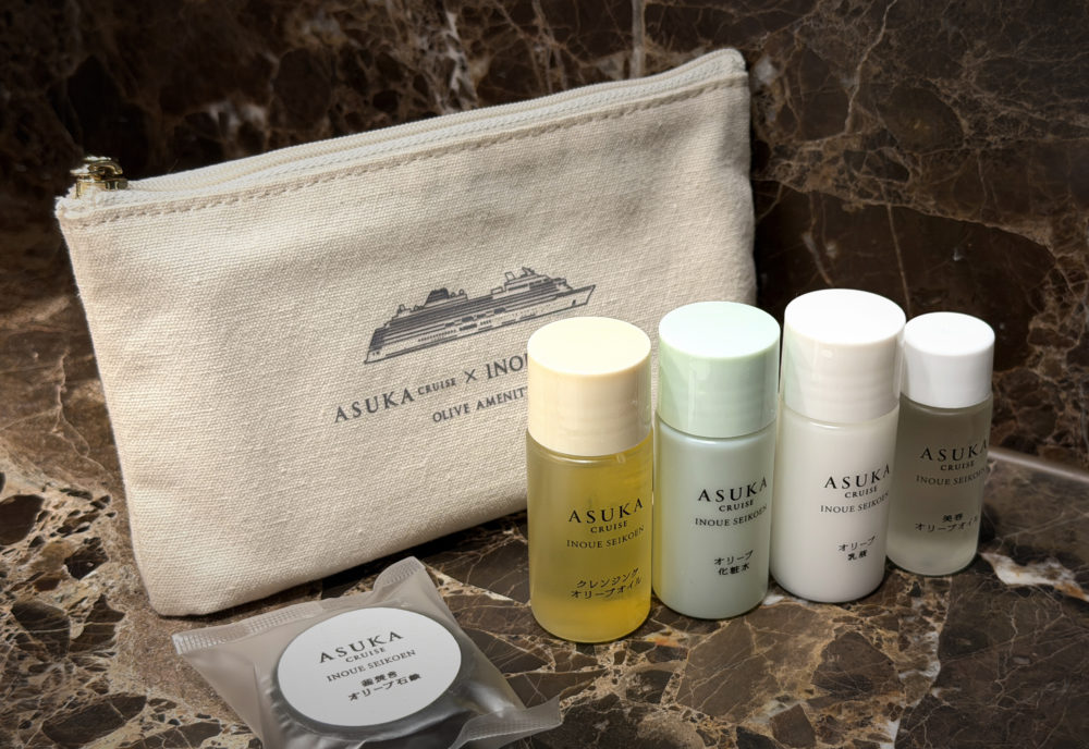 船内とは思えないほどゆったりとしたバスルームには、小豆島産オリーブオイルを使ったオリジナルアメニティが並んでいた。長期滞在を見据えた広いワードローブも用意されており、旅慣れた洒落者にとっては頼もしいスペースである。