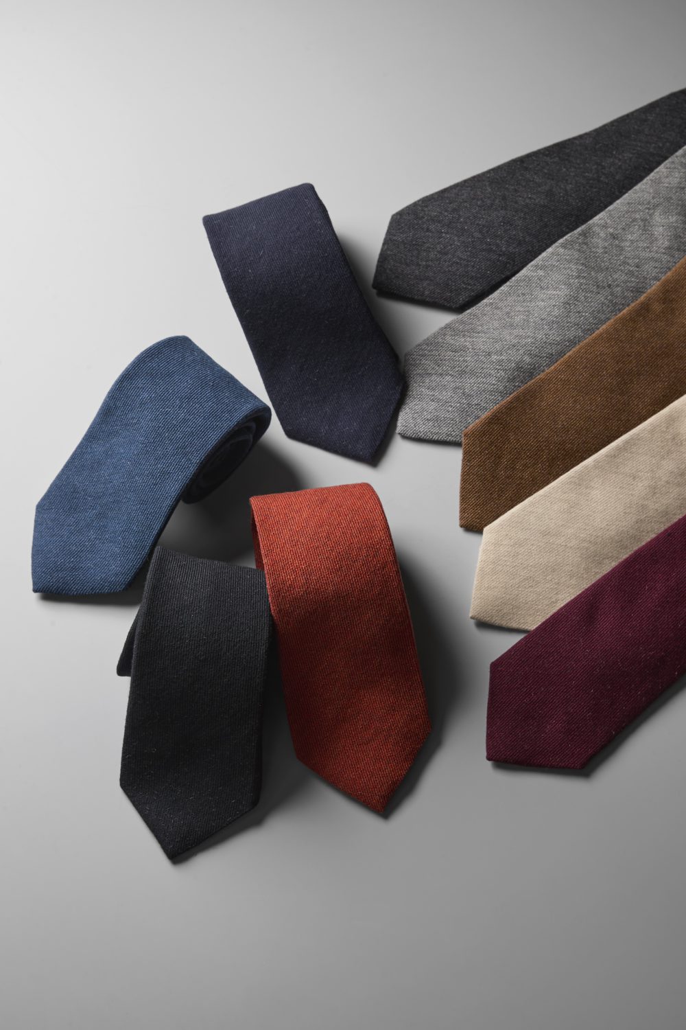 Right: イタリア・トスカーナの高級紡績メーカーであるビアジオリ モデスト社のカシミア糸を使用し、ビエラで織り上げたカシミア生地が極上の風合いを備えるカシミア100%タイ。大剣幅は8㎝で、9色展開。驚異的価格。Spun in Tuscany by esteemed mill Biagioli Modesto and woven in Biella, this pure cashmere tie embodies supreme softness and refined texture. Featuring an 8 cm blade and offered in 9 colours, it represents an astonishing value for such luxury. 各¥14,300 Azabu Tailor