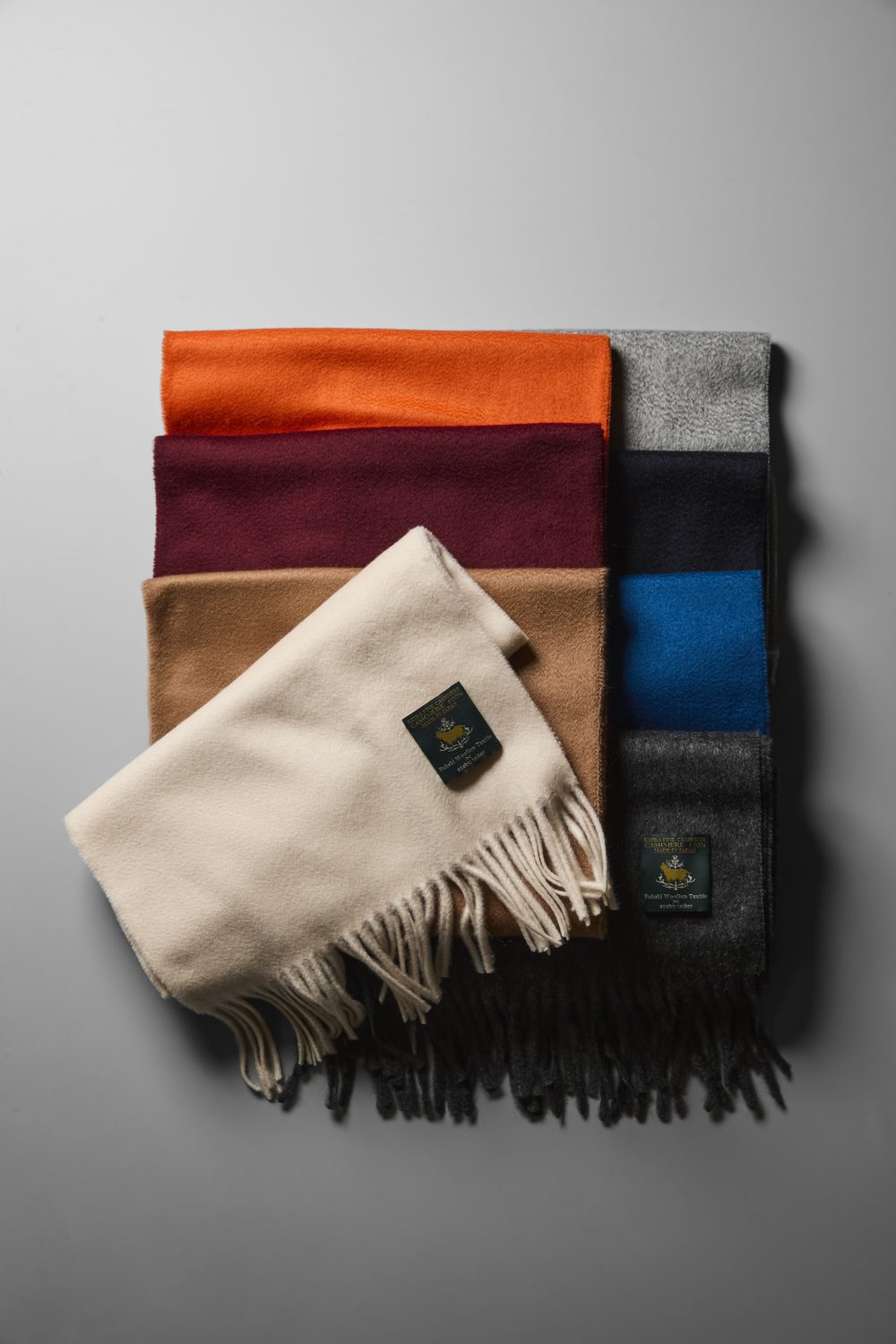 Left: 獣毛繊維に強いこだわりを持ち、原毛からこだわって自社で仕入れ、低速織機で織り上げている、深喜毛織のカシミアを100%使用したマフラー。天然アザミで起毛しており、ウロコが大変美しい。30×180㎝。9色展開。With an uncompromising dedication to noble fibres, Fukaki Keori sources raw material directly and weaves on slow looms to preserve natural character. Made from 100% cashmere, brushed with natural thistles to achieve a lustrous nap, this scarf measures 30 × 180 cm. Available in 9 colours. 各¥19,800 Azabu Tailor