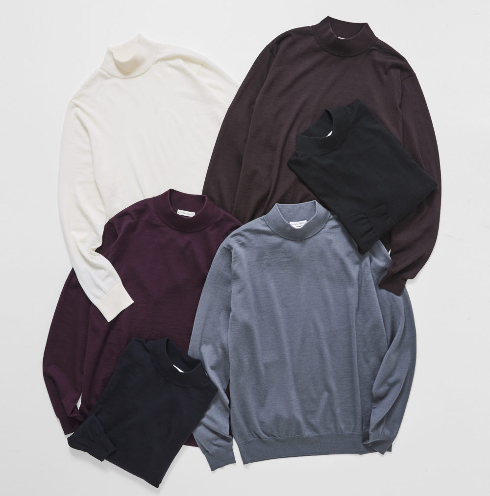 ジャケットのインナーとしてのニットは、カシミア100%よりもウールベースが重宝することもあり、防縮加工が施されたオーストラリアンメリノウール85%、カシミア15%を使用した上質なモックネックニット。6色展開。Sometimes, a wool-based knit proves more versatile under a tailored jacket than pure cashmere. This refined mock neck is crafted from 85% shrink-resistant Australian Merino wool and 15% cashmere, ensuring both resilience and a supple hand. Available in 6 colours. 各¥19,800 Azabu Tailor