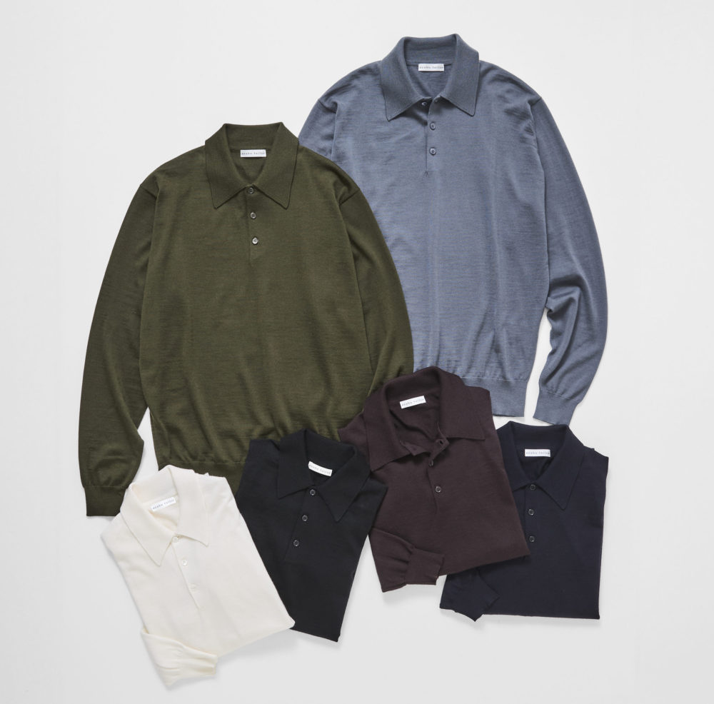 モックネックニットと同じ、防縮加工を施したオーストラリアンメリノウール85%、カシミア15%によるポロニット。テーラードジャケットのインナーとして着たときの、襟の収まり具合にまでこだわっている。6色展開。Cut from the same 85% Australian Merino wool and 15% cashmere blend as the mock neck, this polo knit is designed with the tailored jacket in mind. Even the roll of the collar has been carefully considered for an elegant line beneath a lapel. 6 colourways available. 各¥20,900 Azabu Tailor
