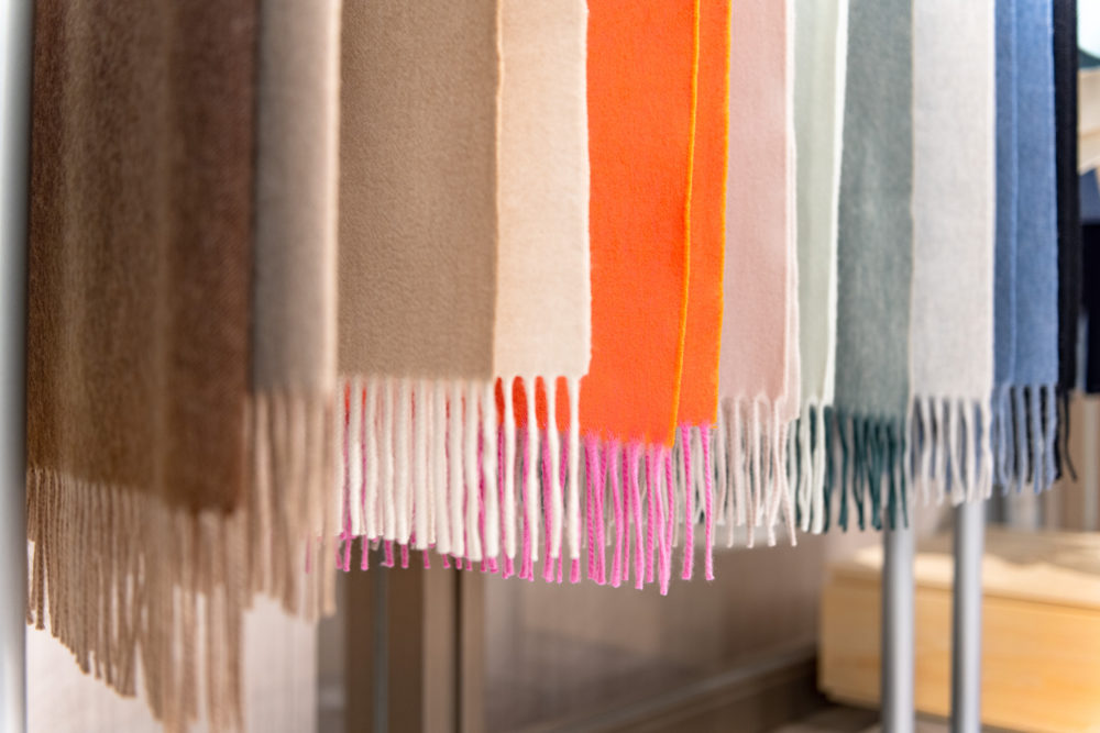 さざ波状の毛並みが特徴のストール「アラン(Arran)」や、特許技術で織られた軽やかなスカーフ「ウィスピー(Wispy)」ほか、日本限定のロゴ入りスカーフ、メンズ&レディースのカシミアニットウエアもラインナップ。