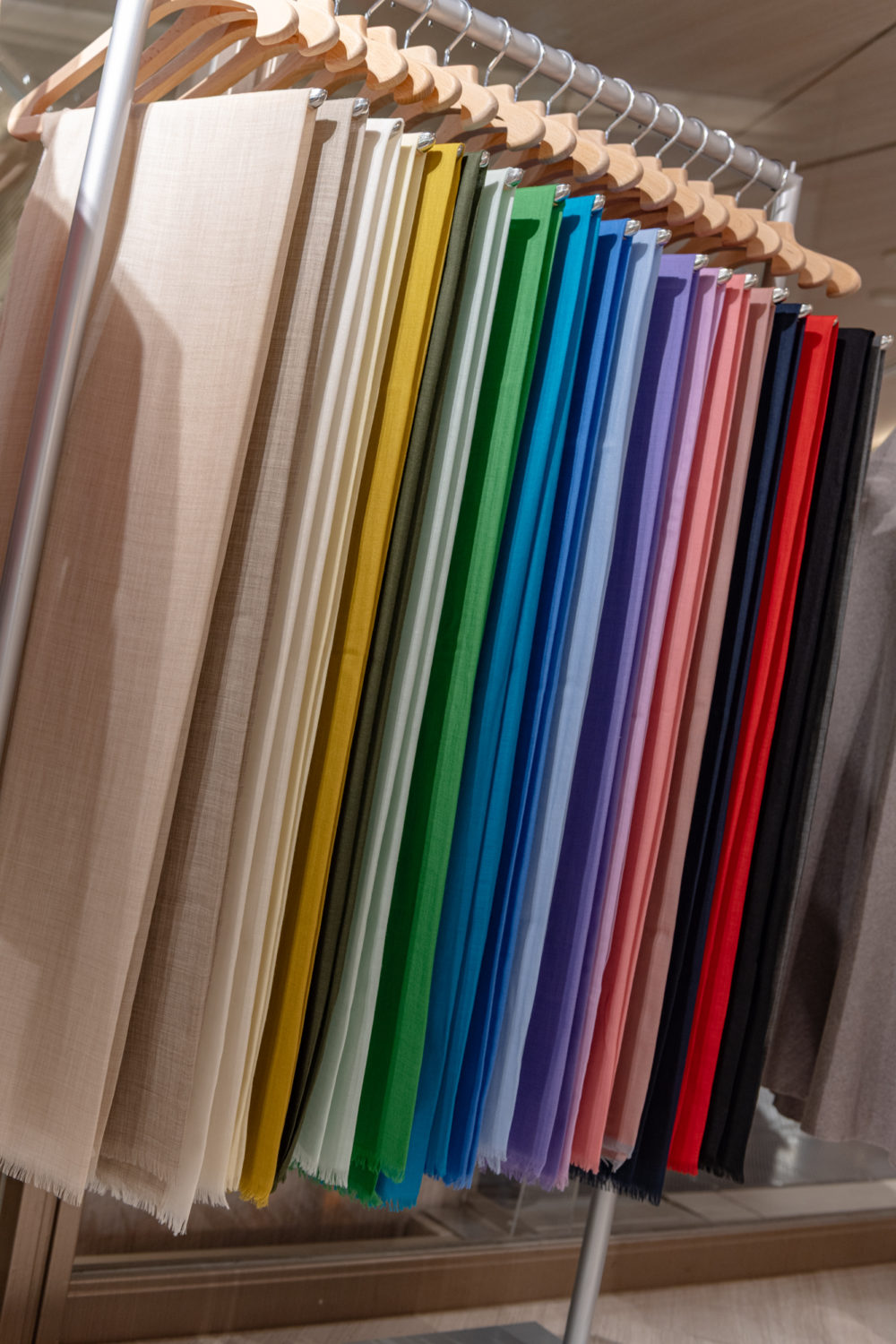 薄手のカシミアストール「ウィスピーソリッド(Wispy Solid)」は、羽根の軽やかさと優しいタッチを備える。そして何より色合いが美しい。各¥143,000 (70 ×200㎝)