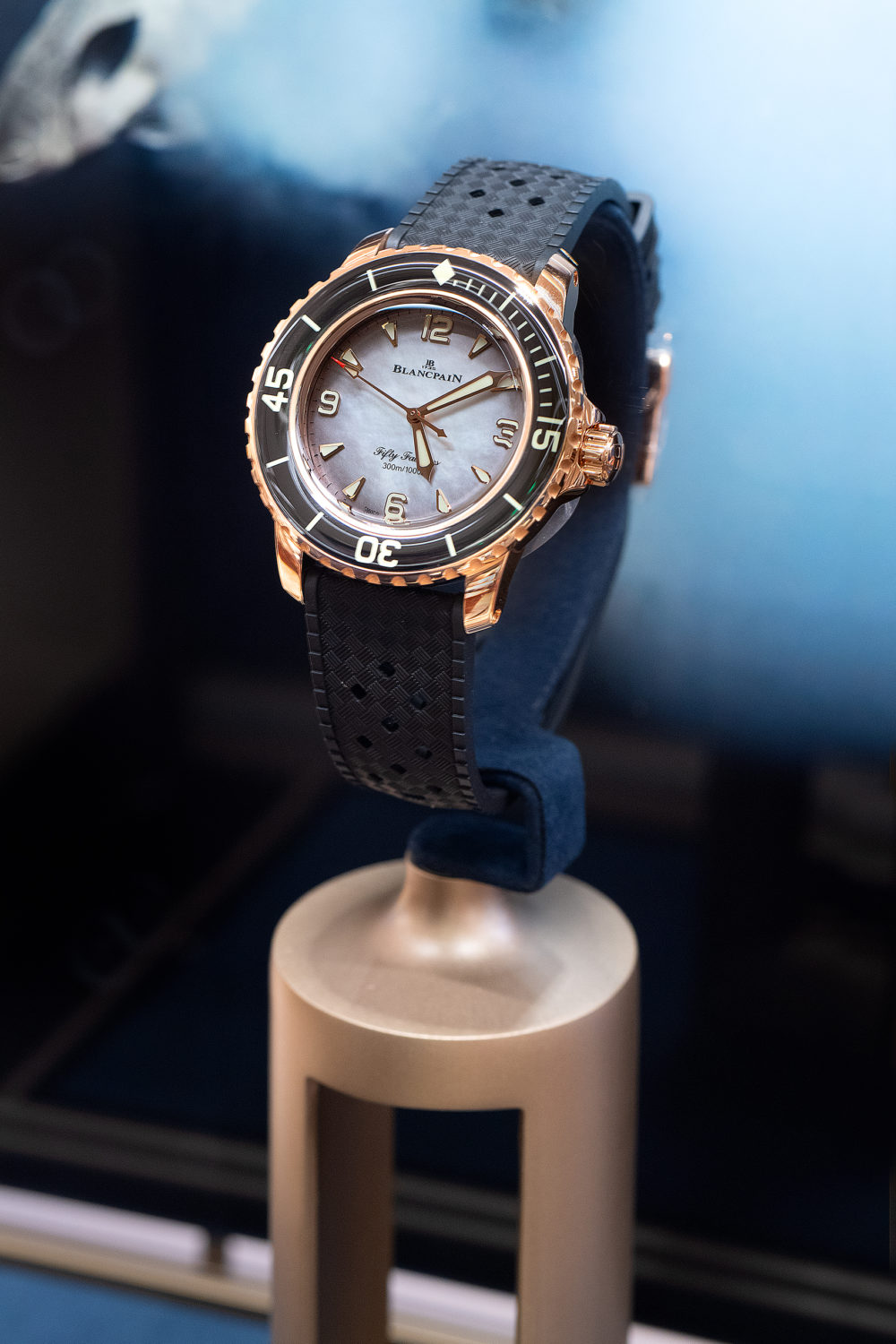 18Kレッドゴールド製ケースにスモーキーなブラックのマザーオブパール文字盤の組み合わせが新鮮。「フィフティ ファゾムス オートマティック」自動巻き、18KRGケース、38mm ¥4,818,000 Blancpain