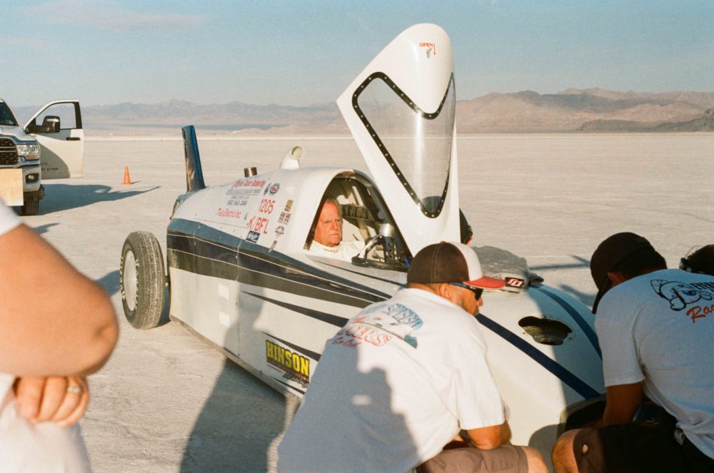 塩の大地で記録挑戦に臨むマシンを見る体験は、他に類を見ない。3マイル地点からだと、マシンは地平線上に浮いているかのようで、軌跡に沿ってほとんど不自然なほどの速さで進んでくる。まるで早回し映像のように前方へと滑り出し、飛翔する弾丸のようだ。エンジン音は低く、機械的で、それはクルマというより飛行機か兵器のように響く。