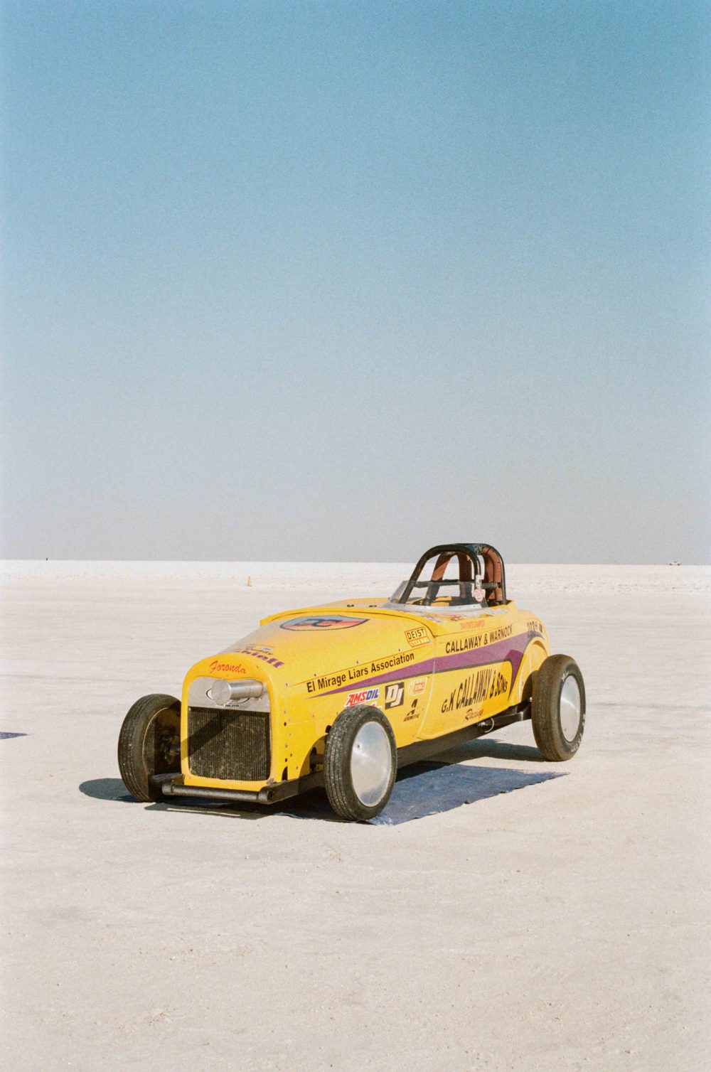私はロンドンから約7,700kmの“巡礼”を敢行した。まずロサンゼルスに飛び、そこからクルマで北へ1,000km、モハーヴェ砂漠を抜け、ラスベガスを経由しておよそ10時間のドライブだ。北へ進むにつれて道はひたすら真っすぐになり、風景は劇的に変貌していった。砂塵はやがて塩の白い大地に変わり、荒涼とした月面のような光景が広がる。そしてボンネビル・スピードウェイ・ロードのカーブを抜けたとき、ついに目的地へ辿り着いたのだと実感した。