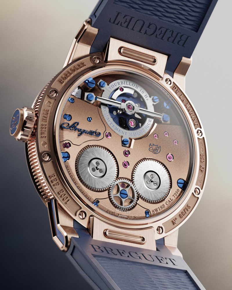手巻きのCal.7250は、マグネティック・コンスタントフォース脱進機搭載の10Hzトゥールビヨン。部品点数は266個。それぞれふたつのゼンマイを備えたダブルバレルを採用し、72時間のロングパワーリザーブを確保。