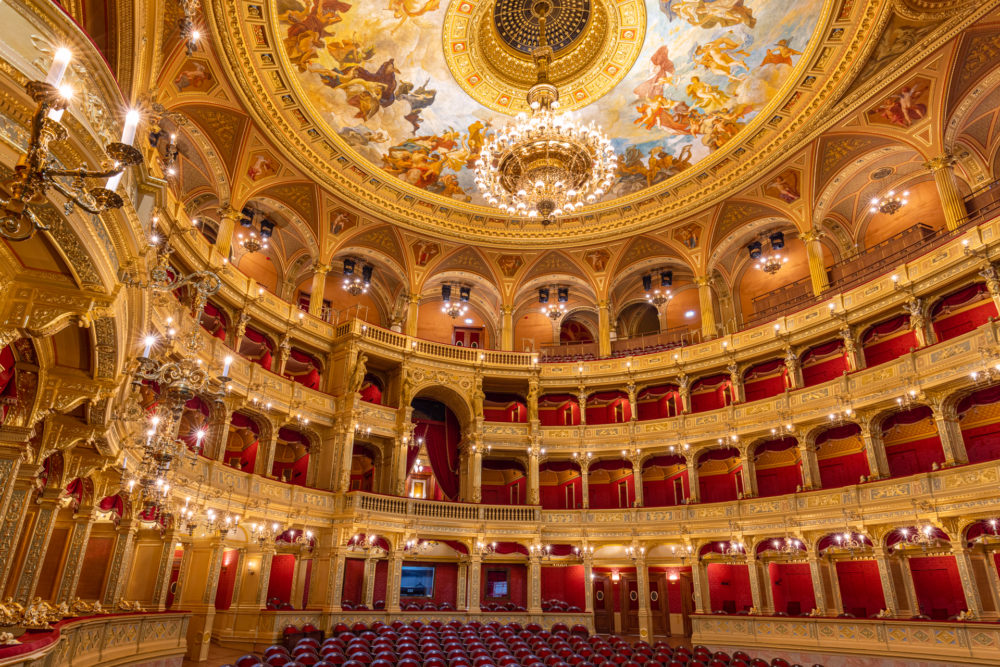 ブダペスト観光の目玉のひとつとして欠かせないのが、2022年に大規模改修された「ハンガリー国立歌劇場」。19世紀ネオルネッサンスの建築は歴史的価値が高いが、かつては貴族の社交場として機能し、その文化的価値も感じられる。約25mの高さにある天井画や煌びやかな装飾に囲まれた舞台は圧巻。まさに芸術の殿堂である。