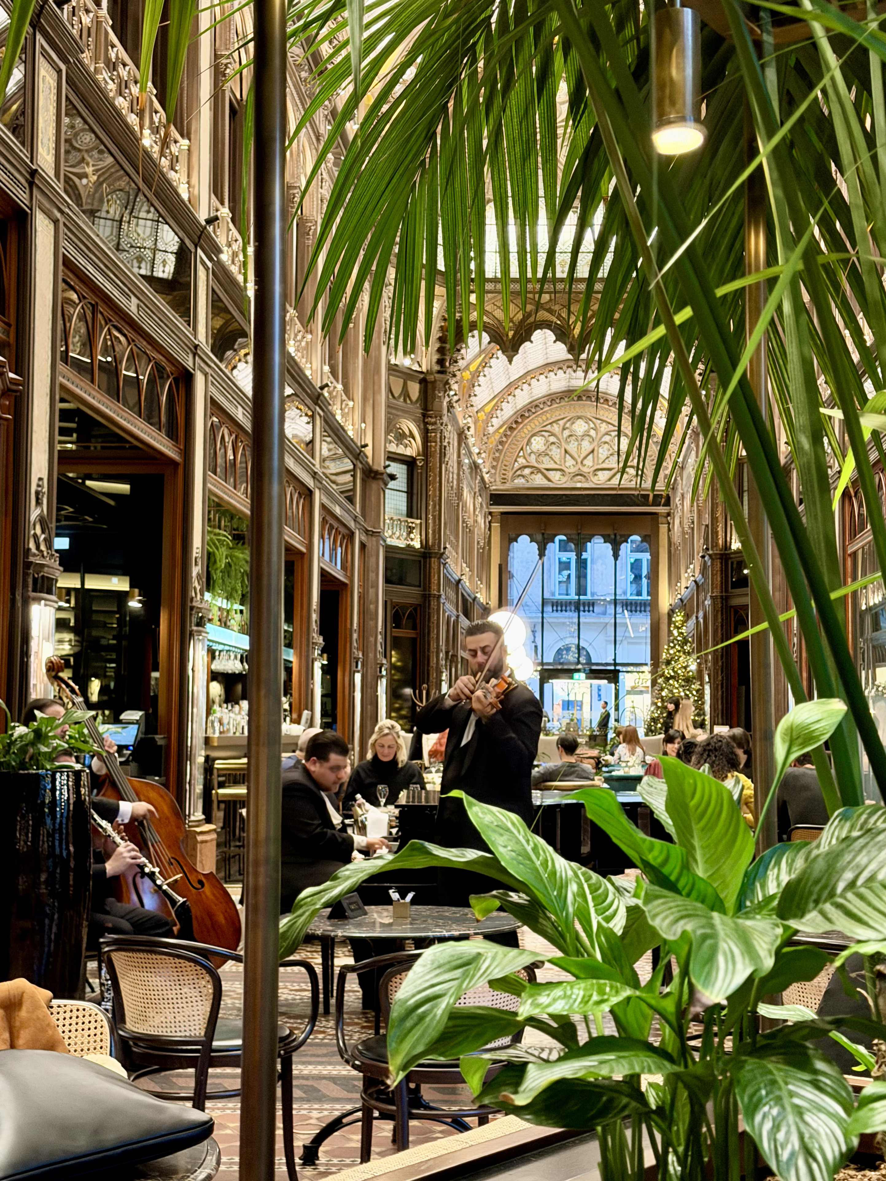 午後は「Párisi Passage Café & Restaurant」でコーヒーブレイク。アール・ヌーヴォー装飾が美しい吹き抜けの空間で、音楽家たちによる生演奏が流れる人気のカフェ。ドボシュトルタやエステルハージィトルタといった伝統菓子を頬張りながら、19世紀のカフェ文化の豊かさに触れる甘美な時間が流れる。街を包む空気には、確かな品格と温度が感じられた。