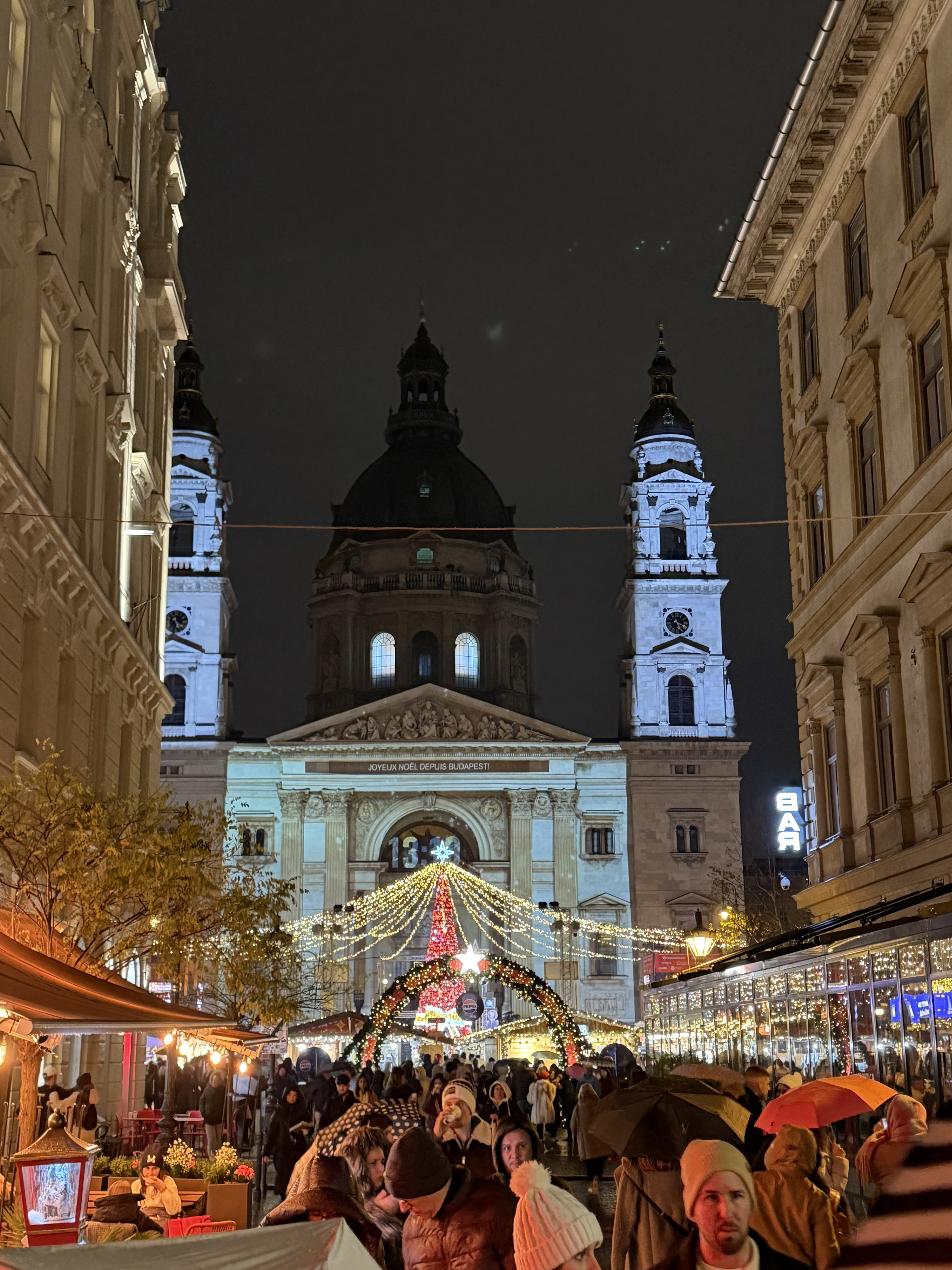 ホテルへ戻る途中に訪れたのは、旧市街の中心地にある「聖イシュトヴァーン大聖堂」。ハンガリー王国の初代国王イシュトヴァーン1世にちなんで名づけられた、ブダペストを代表するランドマークで、ハンガリー国会議事堂と並んで最も高い建造物である。この荘厳なドームに、ハンガリー初代国王イシュトヴァーン1世の右手の聖遺物(ミイラ)が安置されている。大聖堂の周辺ではクリスマスマーケットが開かれ、グリューワインの香りとともに、聖と俗、静寂と賑わいが美しく交錯していた。