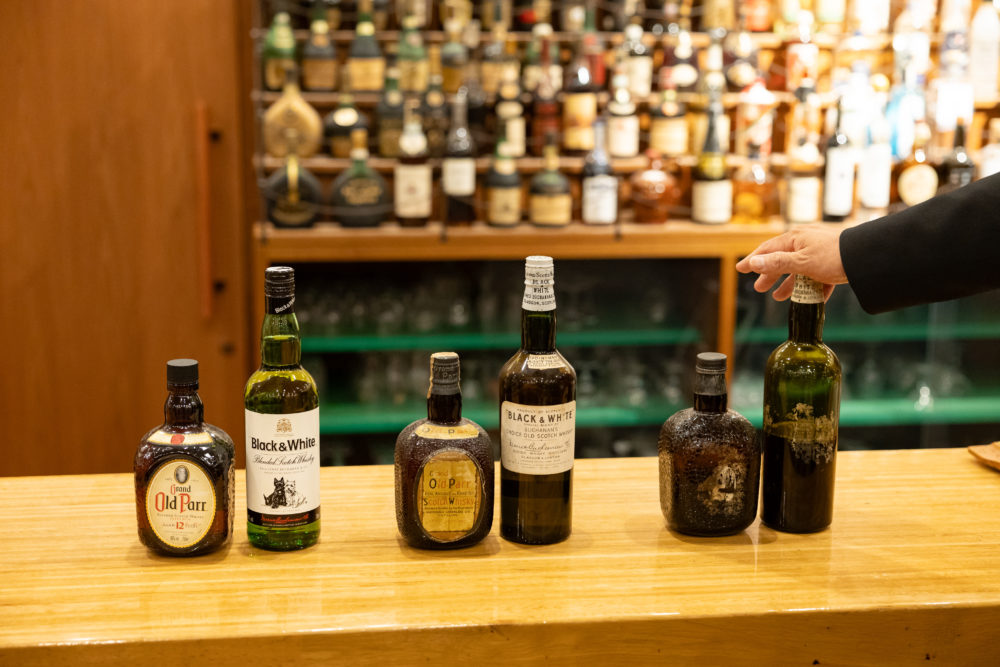 温かみのある木のカウンターに並ぶ、Grand Old Parr やBlack & Whiteの古いボトルたち。それは、この倶楽部を訪れた賓客たちの記憶を、静かに封じ込めているかのようだ。