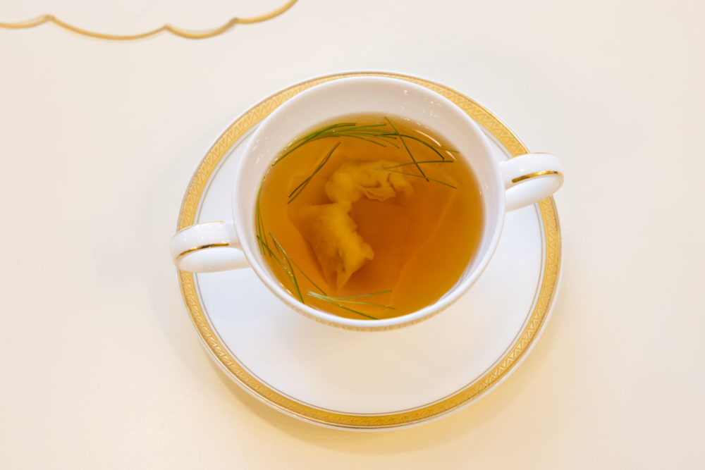 海の幸のカリフラワーのムース ジャルダン風がスペシャリテにもなっている、香味野菜と牛すね肉、鶏がらなどを絶妙なバランスで60時間火にかけながら、細やかな工程を経て生まれる琥珀色の「コンソメスープ」。クラシックフレンチの真髄だ。