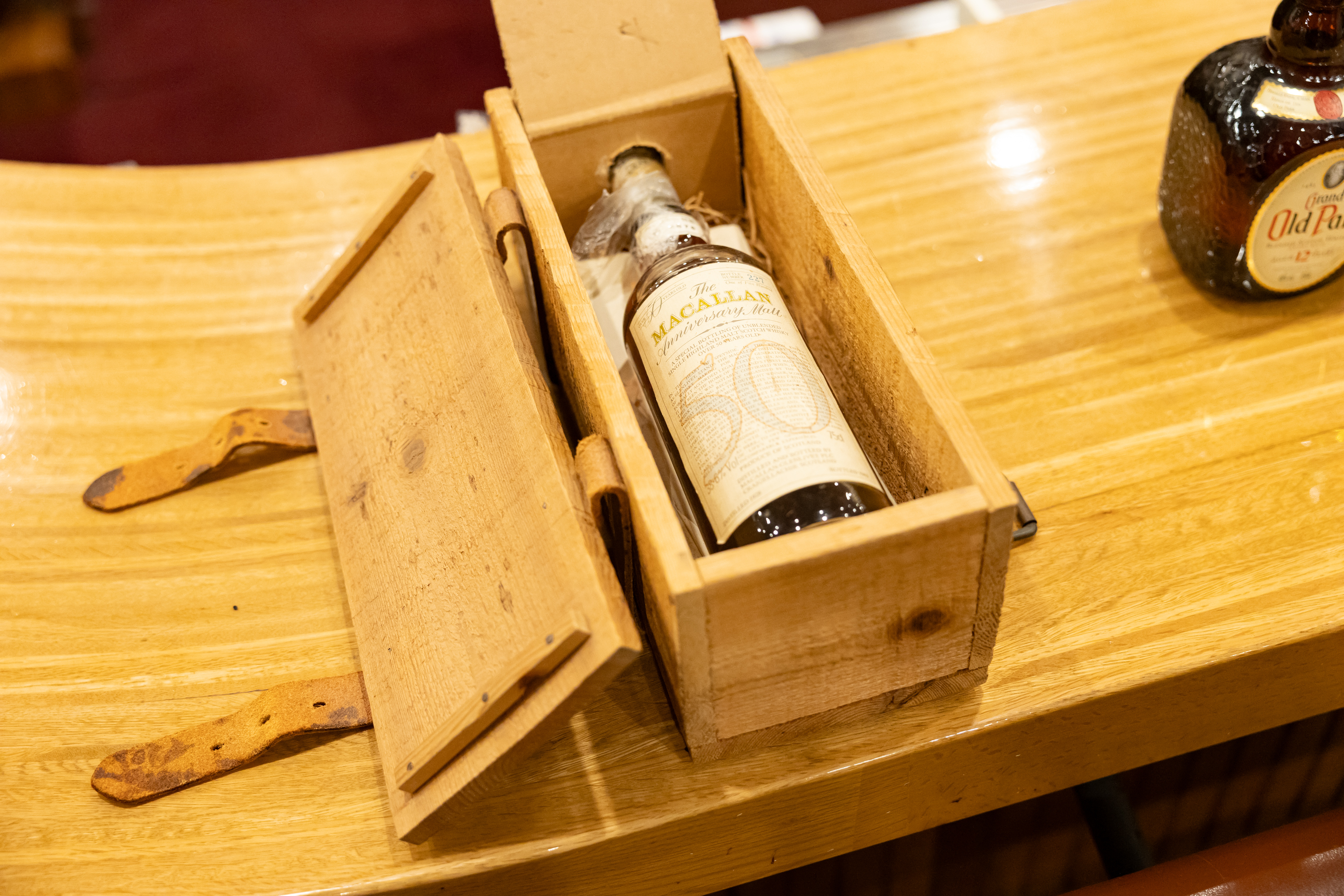 バーは静かな照明のもと、空気に深い落ち着きが漂っている。木の艶が光を柔らかく受け止め、時の流れがほんの少しだけ緩やかに感じられた。壁一面に並ぶボトルは、どれも長い歳月を経た記憶のようだ。中にはThe Macallan 50年(1928年に蒸留)。琥珀の光を宿したその存在が、ただの社交場ではないことを物語っている。
