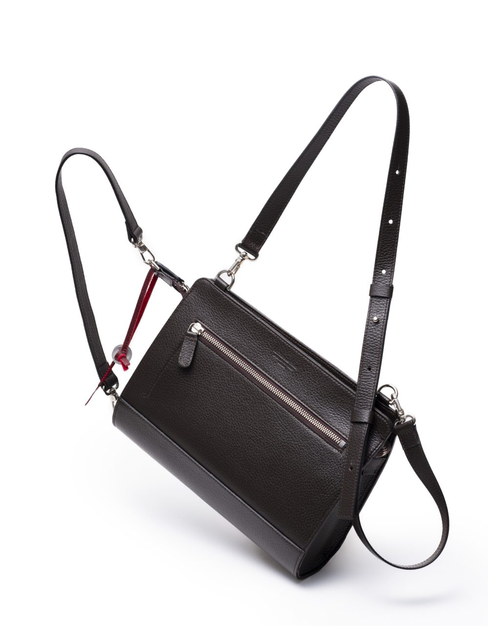 素材には伊ヴェネト州の名門タンナー、ポレット社によるシュリンクエンボスレザーを使用。傷が目立たず、使い込むほどに風合いが増す。ブラック・チョコ(写真)・グレージュの3色展開。The material used is shrink-embossed leather from Poletto, a renowned tannery in Italy’s Veneto region. Scratches are less noticeable, and it develops a richer character over time with use. Available in three colors: black, chocolate (pictured), and greige. ¥69,850 Fattoria del Cuoio(コマコ・オフィチーナ Tel.03-4500-8587)