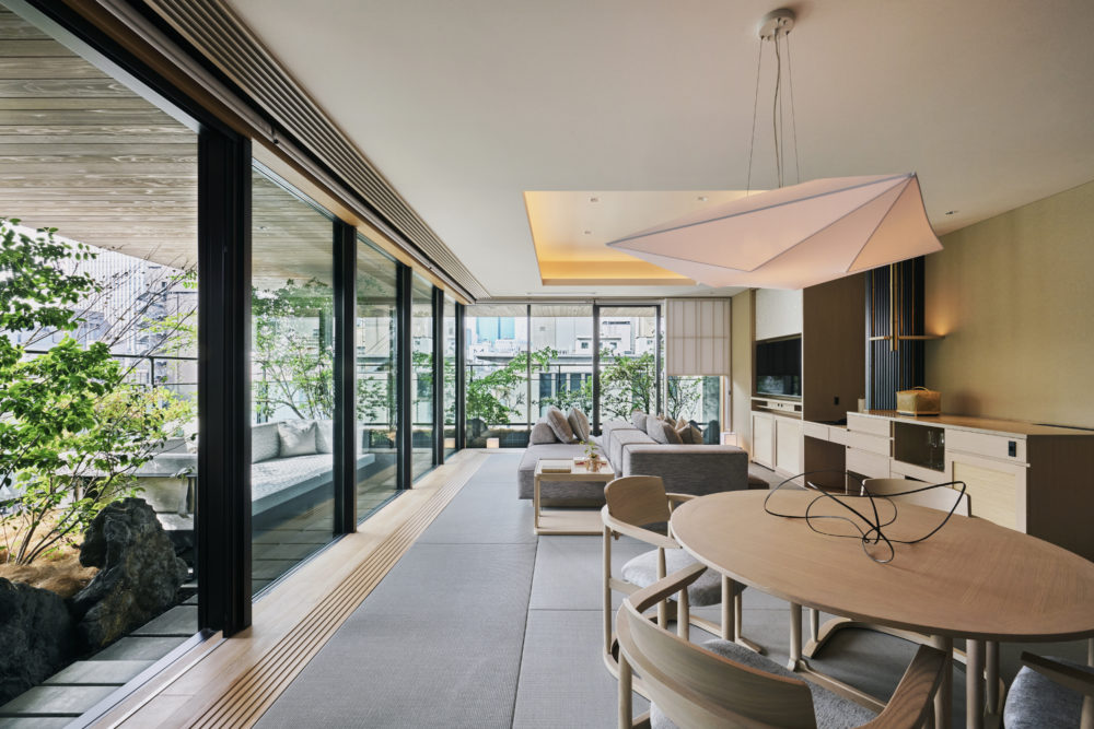 コーナー窓から自然光とグリーンのコントラストが差し込み、洗練と雅が息づく落ち着いたインテリアと見事に調和する約115㎡のラグジュアリーコーナースイート。テラスにもソファが設えられ、ゆっくりと寛ぐことができる。そのほか、全34室11タイプの客室を7~11階にて展開。