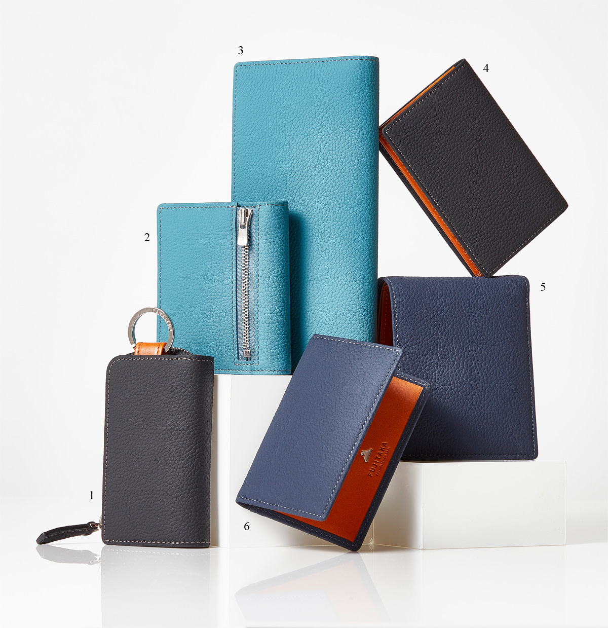 This collection is crafted from shrink-embossed leather supplied by a venerable tannery in Santa Croce, Italy. Distinguished by its supple body, rounded fullness, and sense of refinement, it conveys an unmistakable air of luxury. The interior is lined with natural leather thoroughly infused with oil, creating a striking contrast with the outer leather. Over time, it develops a deeper hue, offering the pleasure of graceful aging. In terms of construction, a special narrow-edge finish is employed, sharper and closer to a right angle than a standard folded edge, revealing both precision and delicacy. Such details embody FUJITAKA’s artisanal mastery and uncompromising standards. Available in black, navy, and blue. 1.Key case featuring four key rings plus one large ring, a coin pocket, and three additional pockets. 2.Compact bilfold wallet with an external gusseted coin pocket, dual bill compartments, 8 card slots, and two card pockets. 3.Long wallet with flap closure, a bill compartment, coin pocket, fourteen card slots, and five pockets. 4.Card case with a main compartment and five card slots. 5.Bifold wallet with bill compartments, a divided coin pocket, eleven card slots, and three pockets. 6.Pass case with a window pocket, two card slots two additional pockets, and a back pocket.