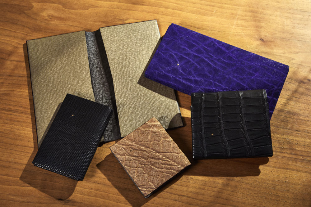 すべて葉合せ仕立てによるもの。エキゾチックレザーが人気だ。左端から時計回りに、名刺入れ¥52,800、長財布各¥132,000、二つ折り財布¥159,500、コインケース¥52,800 all by T•MBH All items feature HA-AWASE construction. Exotic leathers are popular. Clockwise from left: Business card case ¥52,800, long wallet¥132,000, bifold wallet ¥159,500, coin case ¥52,800. all by T·MBH(T·MBH浅草橋直営店 Tel.03-5829-4135)