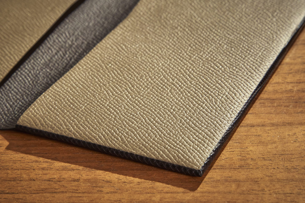 葉合せによって仕立てられた革小物。ベージュの部分と黒い部分は別の革だが、完全に一体化している。ここまで精密に貼り合わせると、縫製するよりも端がヘタリにくくなるという。Leather accessories are crafted using HAAWASE techniques. The beige and black sections are different leathers, yet they blend seamlessly. Such precise bonding makes the edges less prone to fraying than if sewn.