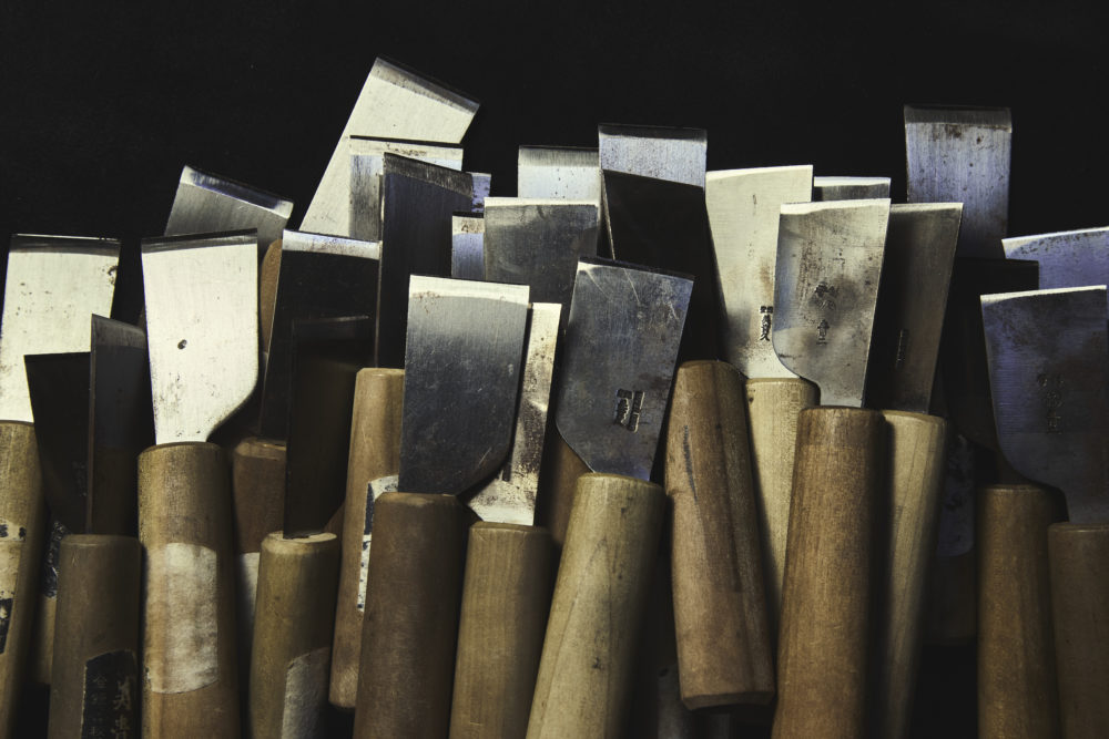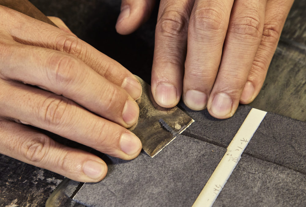 「実は、仕立ての技自体に秘密はないのです。もちろんそれなりの修練は要しますが、努力すれば大抵身につく。我々の虎の子は革 包 丁。それも道具自体ではなく、“研ぎ方”に極意があります。葉合せは革の端を極限まで薄く漉くことが要になるのですが、そのためには革包丁を完璧に研ぎ上げることが不可欠。これは知識と技術の両方を要し、私以外にこなせる人は目下存在しません。ですから、何十本にもわたる革包丁はすべて私自身が研いでいるんですよ」