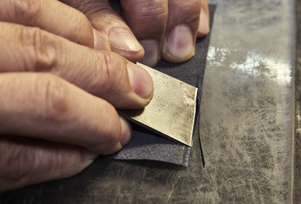 革の端を限りなく鋭利な三角形に漉き落としてから貼り合わせることで、まるで一体化したかのような接ぎ目になる。ここで不可欠なのが秘伝の革包丁なのだ。By shaving the leather edges into an extremely sharp triangle before bonding them, the seam appears as if it were one solid piece. The secret weapon here is the leather knife.