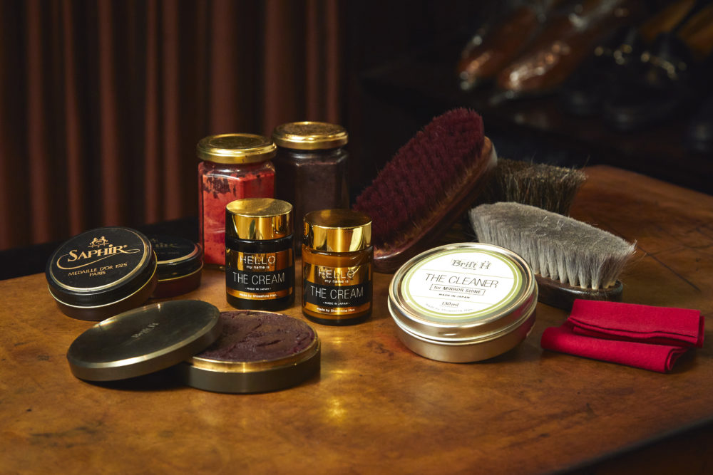 ポリッシュ用のワックスはサフィールを採用。オリジナルの乳化性クリームは化粧品の技術を応用したもの。色の調合は長谷川氏が自ら手仕事で行っている。¥3,080 ブラシ各種は江戸屋に別注。毛の根元を鉄線でまとめてから手植えした逸品だ。豚毛¥14,630、山羊毛¥30,580、馬毛¥16,995 赤い磨き布は大阪の晒し染め工場に別注し、早く光るよう硬さや毛並みを調整している。¥1,320 all by Brift H/ Saphir wax is used for polishing. The original shoe creams are based on cosmetics technology. Hasegawa mixes the colours himself by hand: ¥3,080. Brushes are specially ordered from Edoya. Pig hair: ¥14,630. Goat hair: ¥30,580. Horse hair: ¥16,995. The polishing cloths are made in Osaka: ¥1,320. all by Brift H