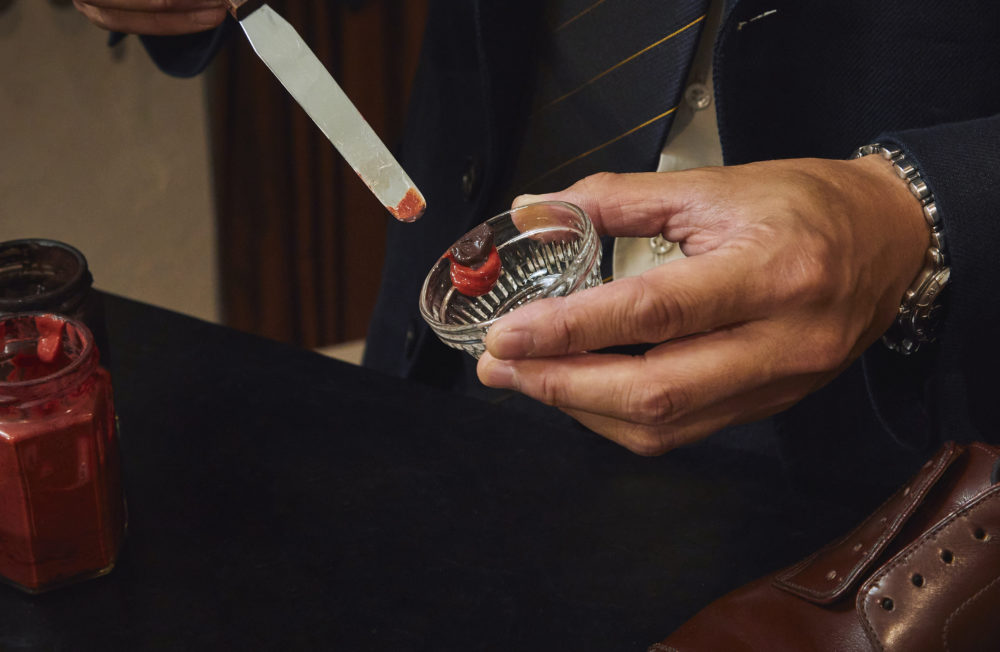 靴の色に合わせてクリームを調合することも。これも長谷川流のアイデアだ。Creams are mixed to match the colour of the shoes.