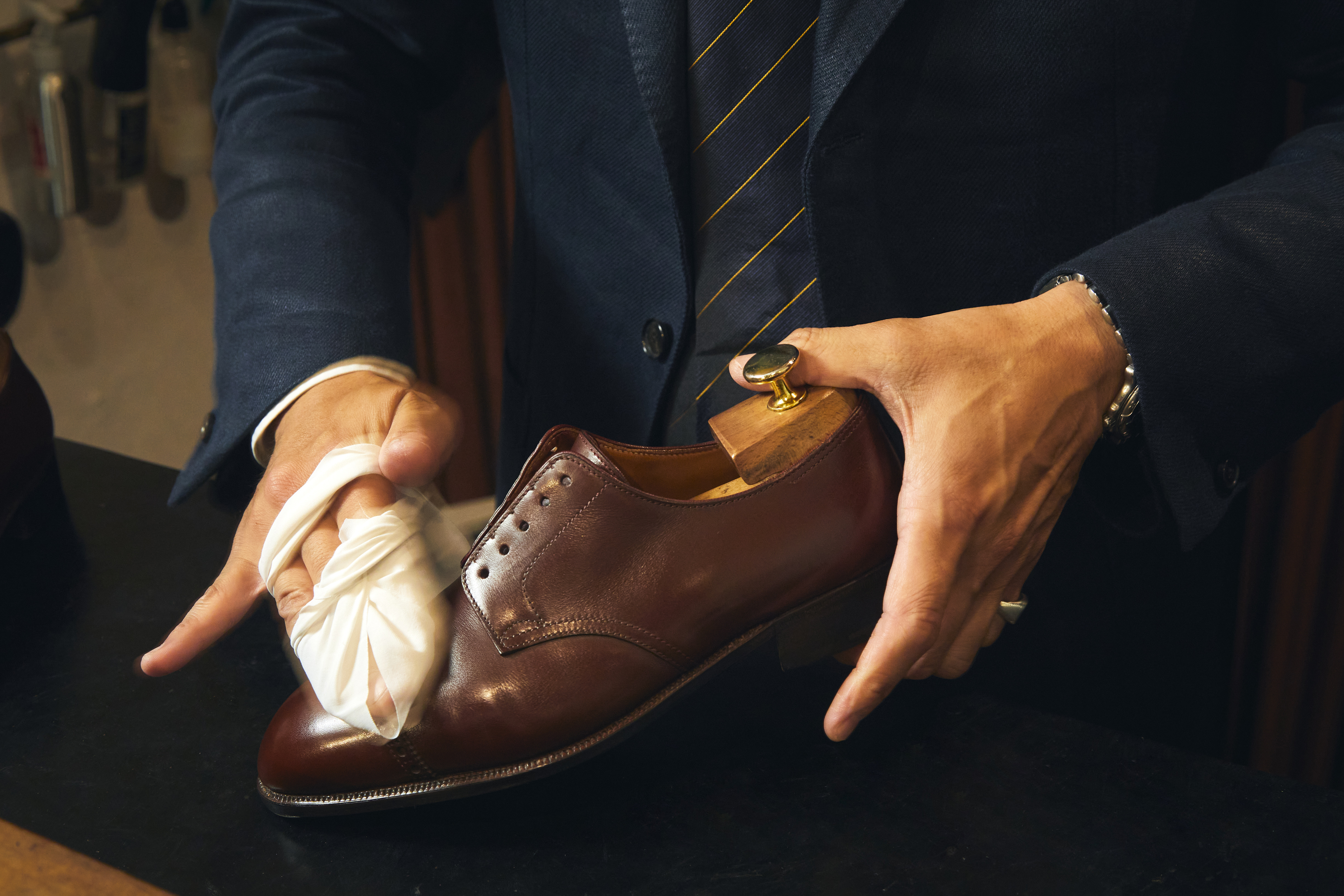 履き込んだ靴がみるみるうちに輝いていく様子はまるで魔法のようだ。It is magical to see worn-in shoes shine in no time at all.