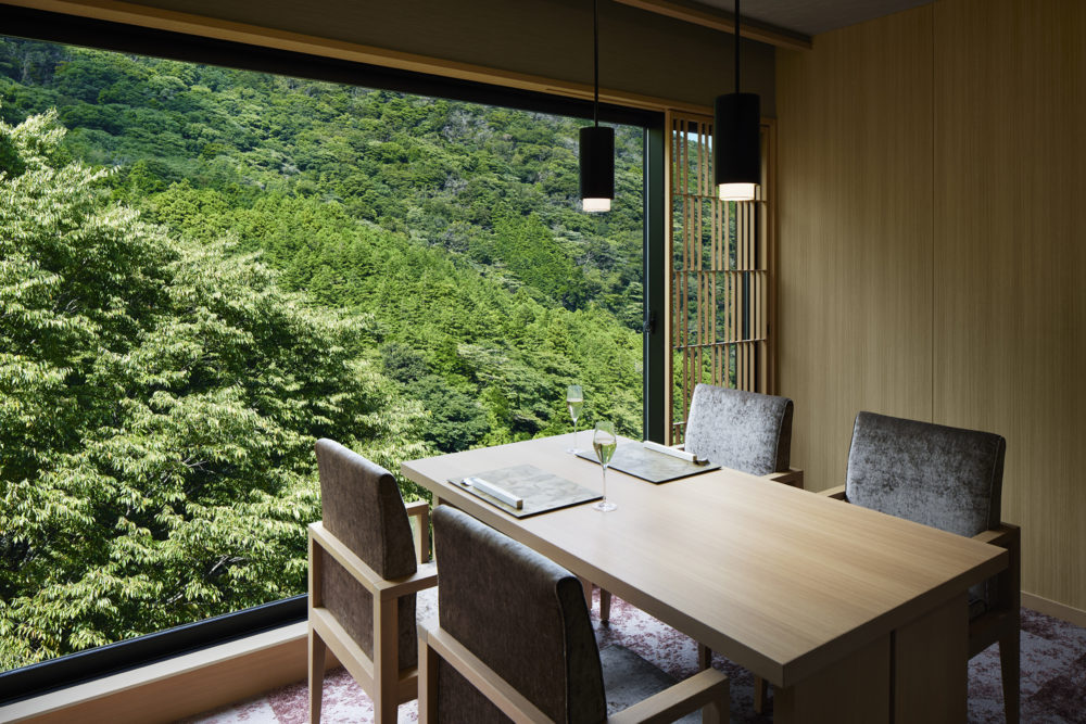 室内は、靴を脱いで上がるスタイルで、畳の部屋や絨毯、なぐり加工の無垢材の床など、いろいろな表情を見せてくれる。13タイプもラインナップしている多彩な客室のなかでも、THE RAKEのおすすめは、ロビーフロアに位置するラグジュアリー Eタイプの「雅(みやび)」。約90㎡の空間には、5メートル近い天井高と大きな窓がもたらす開放感が広がり、リビングでは読書や語らいを楽しみ、畳の間では昼寝をするなど、思い思いの時間を過ごせる。テラスの露天風呂に身を沈めれば、川のせせらぎと山の風が五感を優しく包み込んでくれる。