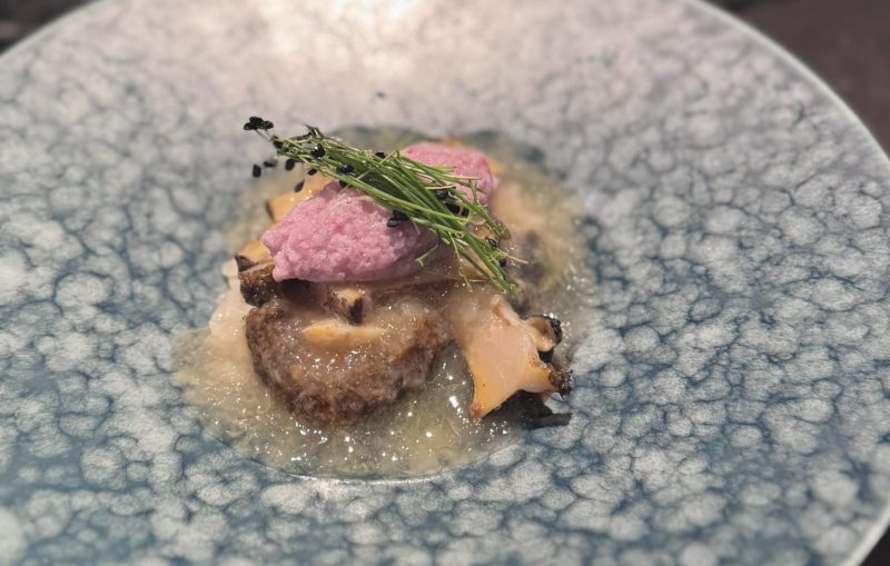 シェフが一番得意とする鮑を使った一品。蝦夷鮑のソテーをメインに、もものすけというピンク色が美しい蕪を使った蕪蒸しを添え、タイムの香りのオイルをプラス。鮑の肝粥を合わせて。(2024年12月のコースメニュー)