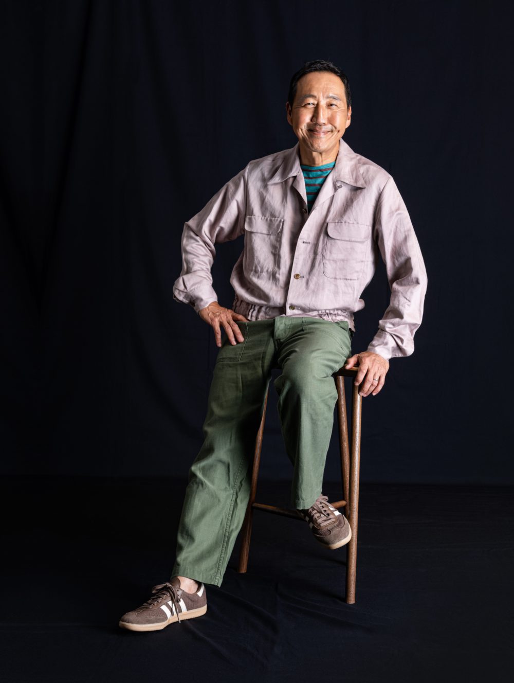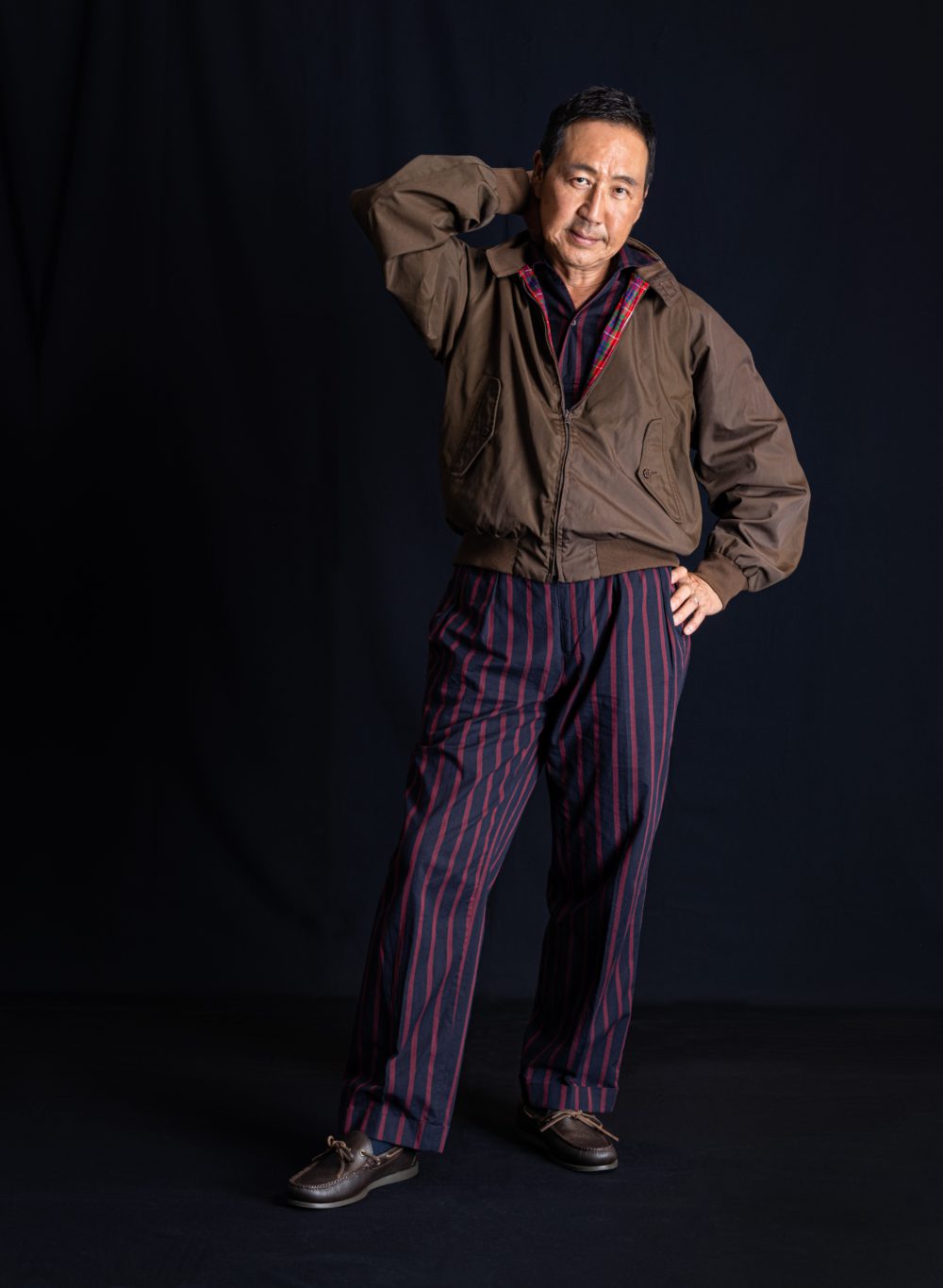 デコラムのブルゾン、セントジェームスのボーダーT、ミリタリーパンツ、アディダスの「サンバ」という合わせ。デコラムは今をときめくバンコクのセレクトショップで、鴨志田氏がオリジナルレーベルのディレクターを務めている。「1950年代のレーヨンブルゾンを、サテン織りのリネンコットンで再解釈した新作のブルゾンです。素材と色も含め、モード感のある雰囲気に仕上がったと思います」。すべてproperty of Yasuto Kamoshita