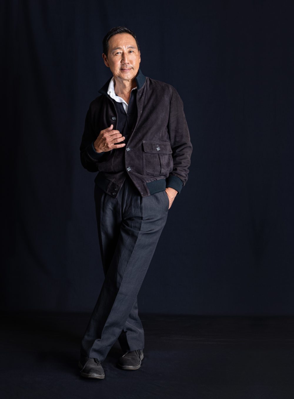 ポール・スチュアートのラムスキンスエードブルゾンとシャンブレーシャツ、アルクーリのタイ、セラードアーのワイドパンツ、ルーディックライターのシューズ。「映画『アンタッチャブル』のアンディ・ガルシア的な、タイドアップでの合わせです。最近、これアリだなって」。レザーブルゾン¥220,000 Paul Stuart(ポール・スチュアート 青山本店 TEL.03-6384-5763) タイ¥18,700 Arcuri / United Arrows Roppongi Hills(ユナイテッドアローズ 六本木ヒルズ店 TEL.03-5772-5501) シャツ、パンツ、シューズ すべて property of Yasuto Kamoshita