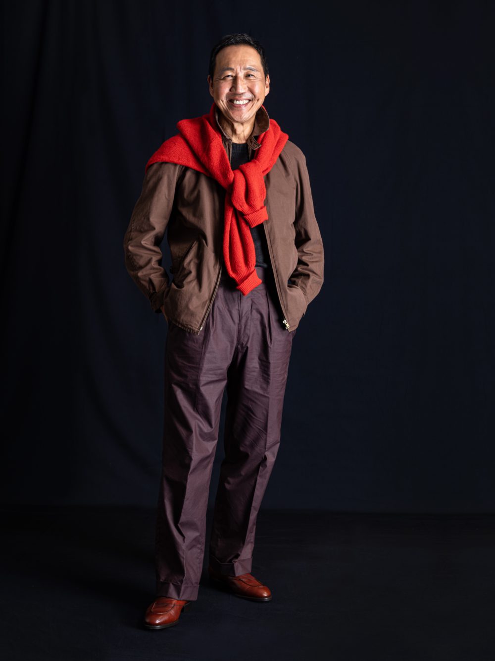 80年代にビームスで展開していたP&Oの高密度コットンブルゾン、Hのサマーニット、ポール・スチュアートのコットンシルクパンツ、ハンシューメーカーのローファー、そしてファニ レママイヤーのアルパカカーディガンを肩がけしたスタイル。「赤をどう着たらカッコいいかというのがマイブームで、その色合わせを楽しんでいます。カッコいいことをいうと(笑)、マーク・ロスコの赤が大好きなんです。テート・モダンに飾ってある赤から茶色、黒にかけてのグラデーションが昔から好きで、それをイメージした感じかな」。すべて property of Yasuto Kamoshita