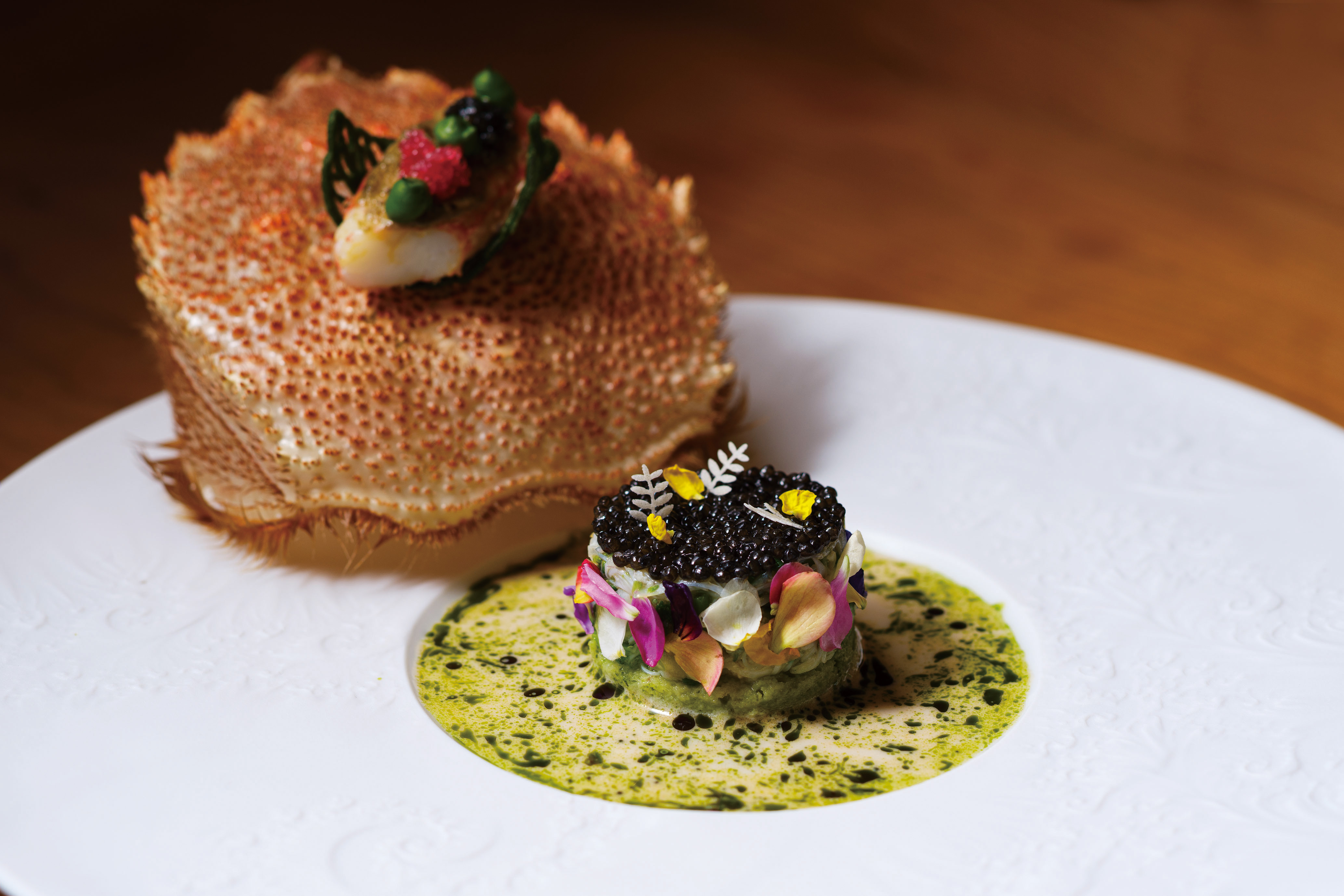 季節のコース「啓蟄―春分」¥38,000~。写真は冷前菜の「毛蟹」。