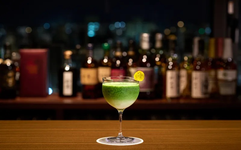 抹茶や水尾の柚子といった京都の素材を使ったシグネチャーカクテル「マウント比叡」¥3,500。