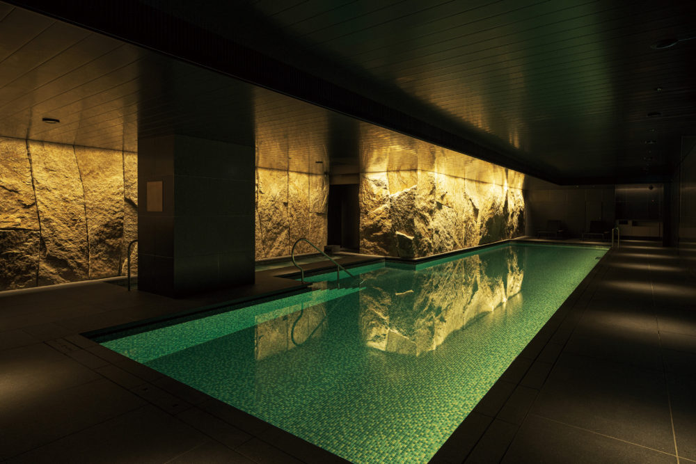 弥栄会館時代の外壁に使用された北木石を使用した洞窟のようなプール。他に、フィットネス、温浴、スパトリートメントがあり、祇園にいながら心安らぐひと時を過ごせる。