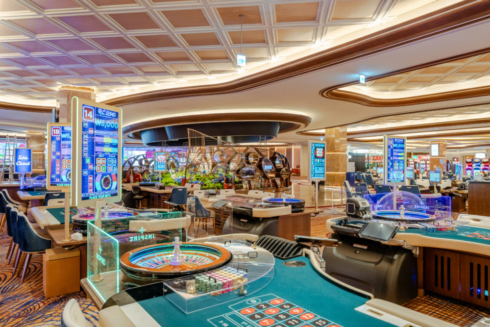 インスパイアの核は、外国人専用カジノだ。メインカジノは2階に広がり、3階はVIPエリアとなっている。バカラ、ブラックジャック、ルーレット、ポーカーなど、テーブルゲームは10種類以上。それにスロットマシンと最新鋭のETG(電子テーブルゲーム)が加わる構成だ。本格的に腰を据えて遊ぶことも、カジノ未経験者は夜のエンターテインメントとしてサラッと軽く楽しんでも、あるいはその場の雰囲気だけを楽しむこともできる。